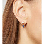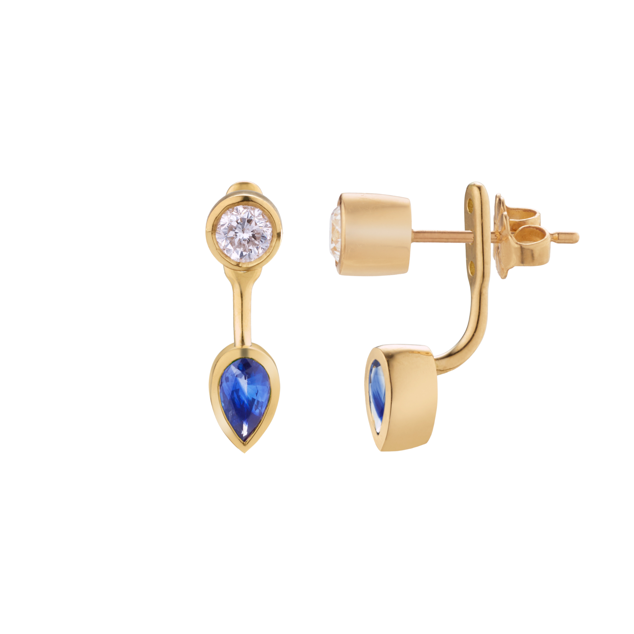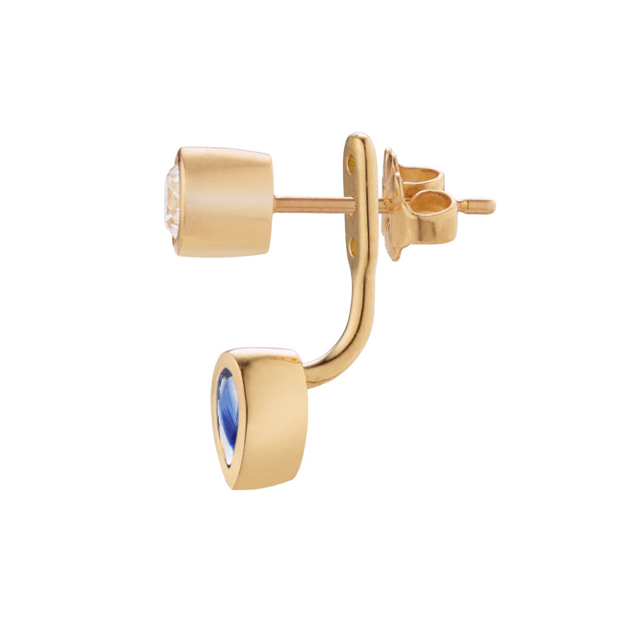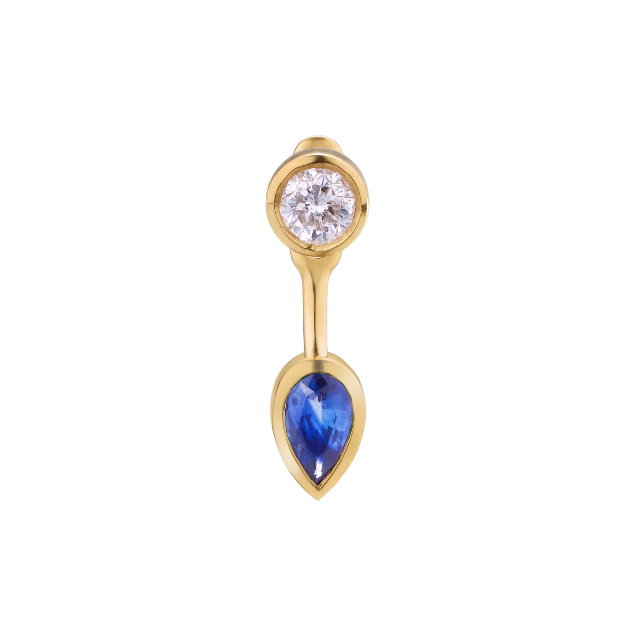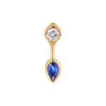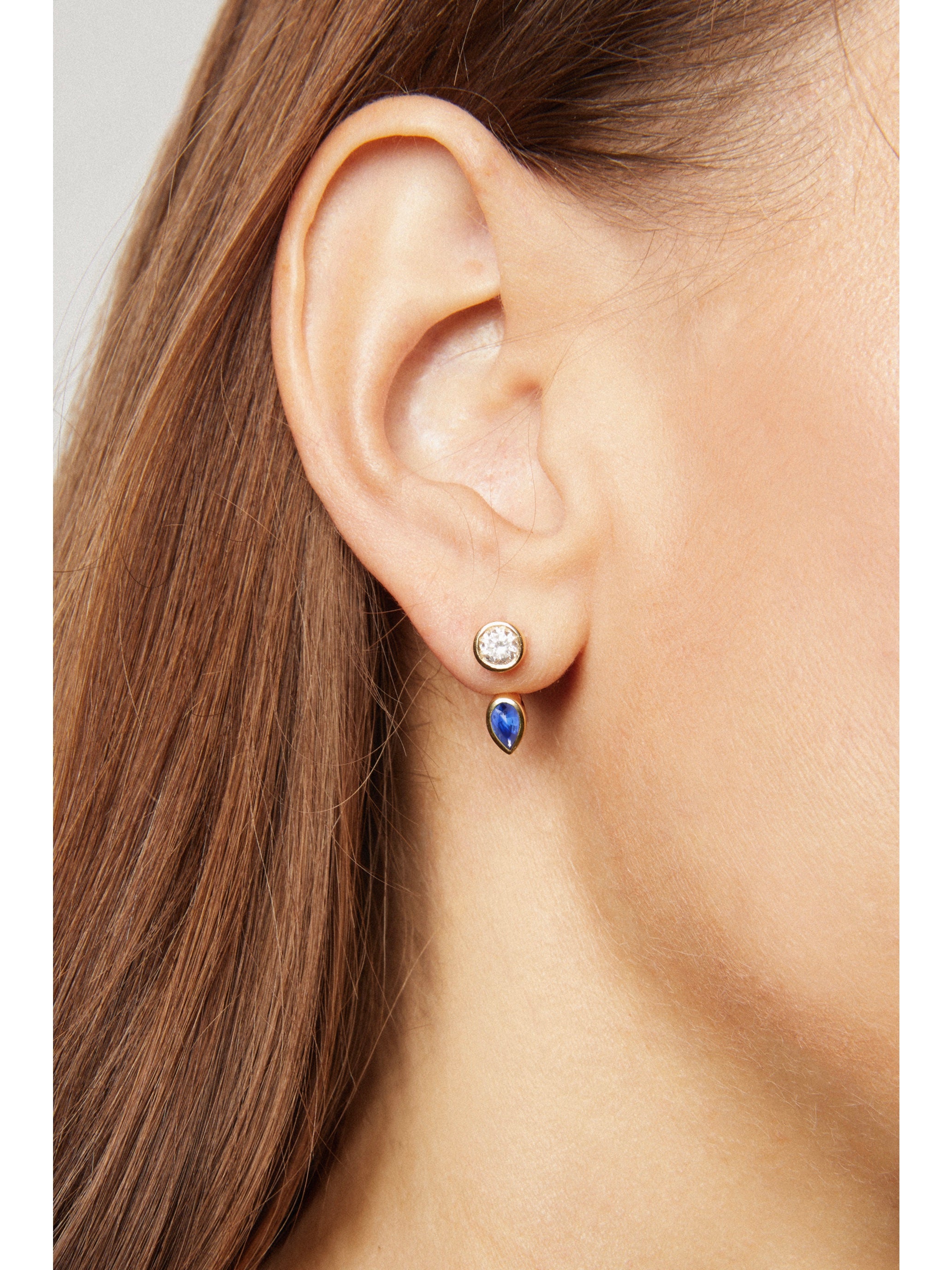 A pear-shaped emerald jacket that curves beneath the stud, adding color and sculptural depth.