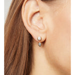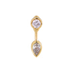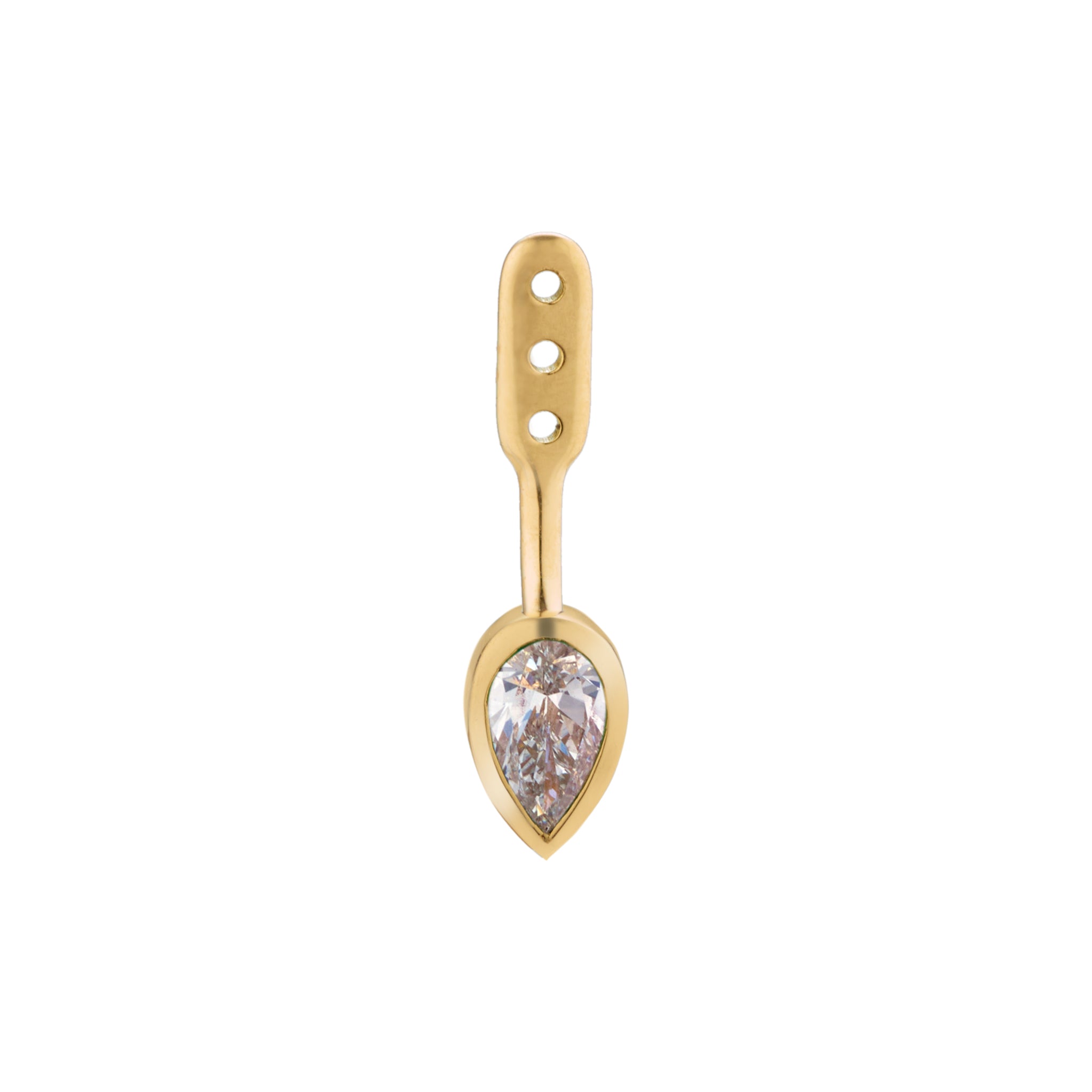 A pear-shaped emerald jacket that curves beneath the stud, adding color and sculptural depth.