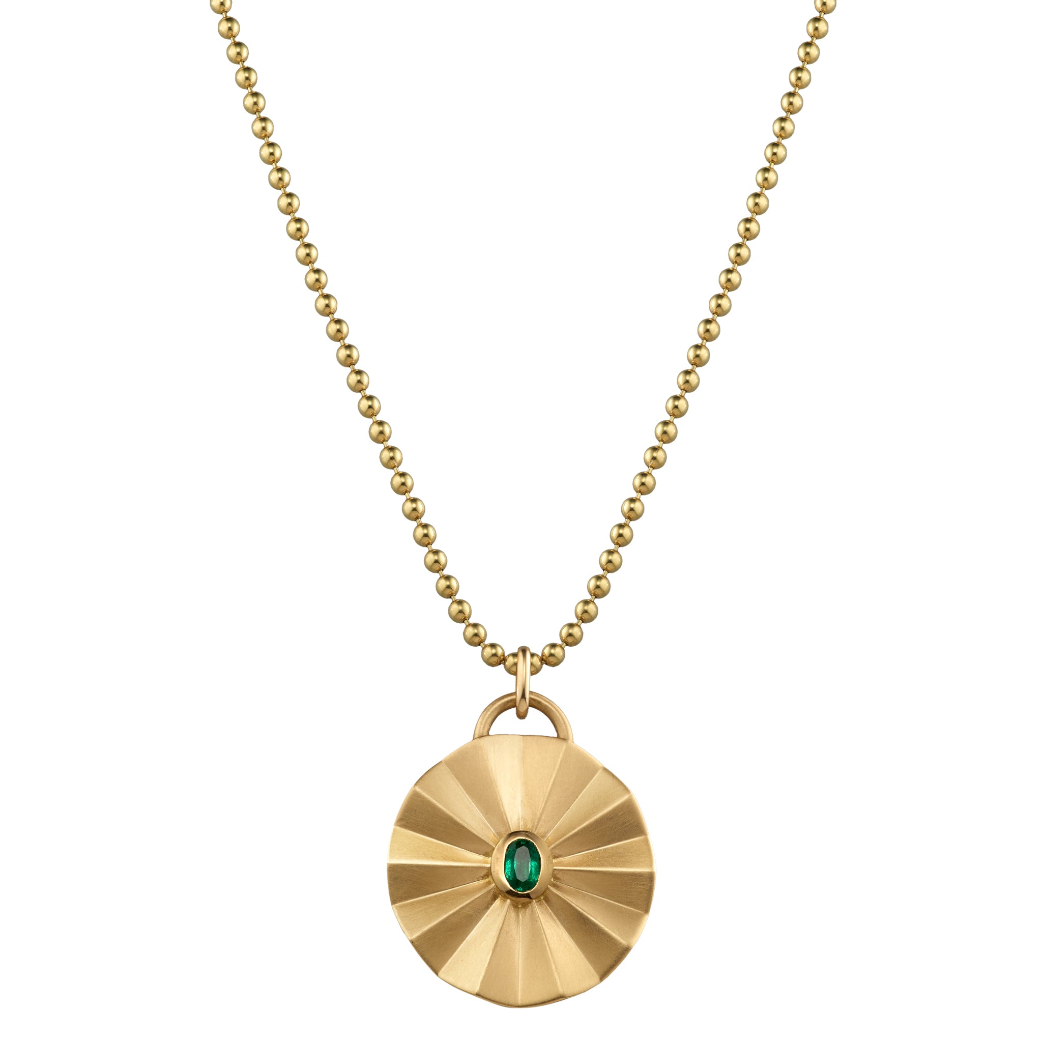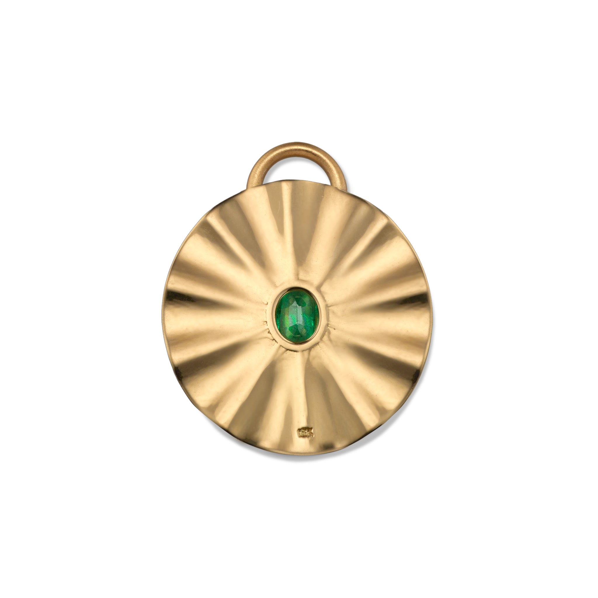Part of the Aegis Collection, the Emerald Water Pendant is crafted in 18K gold and set with a vibrant emerald at its center. The radiant, sculptural surface draws inspiration from water and movement, creating a piece that feels both grounded and luminous. Striking on its own and easy to layer, it brings symbolism and strength to the everyday.