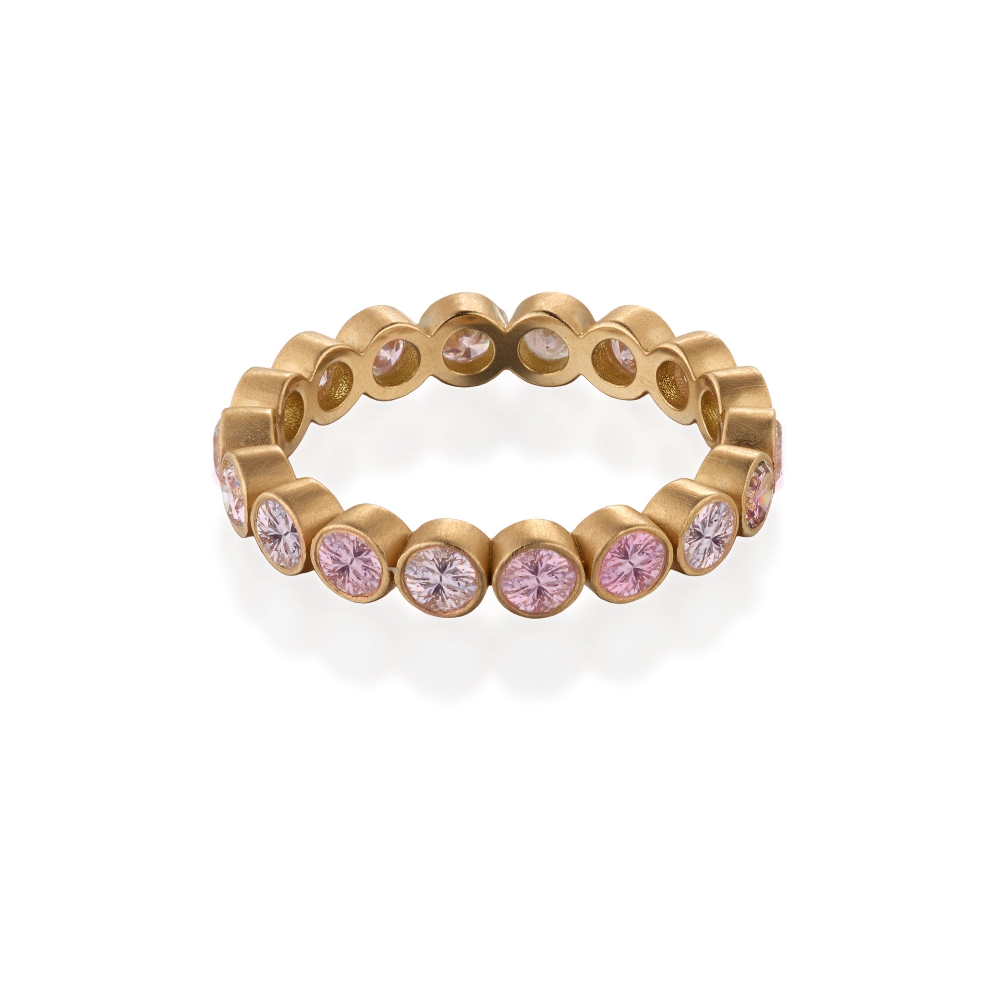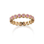 A continuous line of Madagascar pink sapphires set in rich 18K recycled gold, handcrafted in NYC. Each bezel-set stone creates a rhythmic, luminous flow inspired by the harmony of the Circle of Fifths Collection. A modern, wearable eternity band perfect for stacking, celebrating, or adding a touch of vibrant color to the everyday.